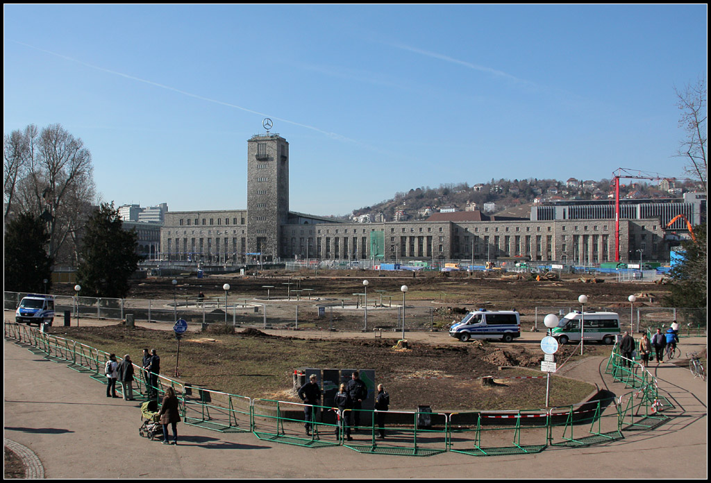 Zur Zeit bietet sich dieser freie Blick auf den Südflügel des Stuttgarter Hauptbahnhofes, allerdings wird dieser von rechts schon "angeknabbert".