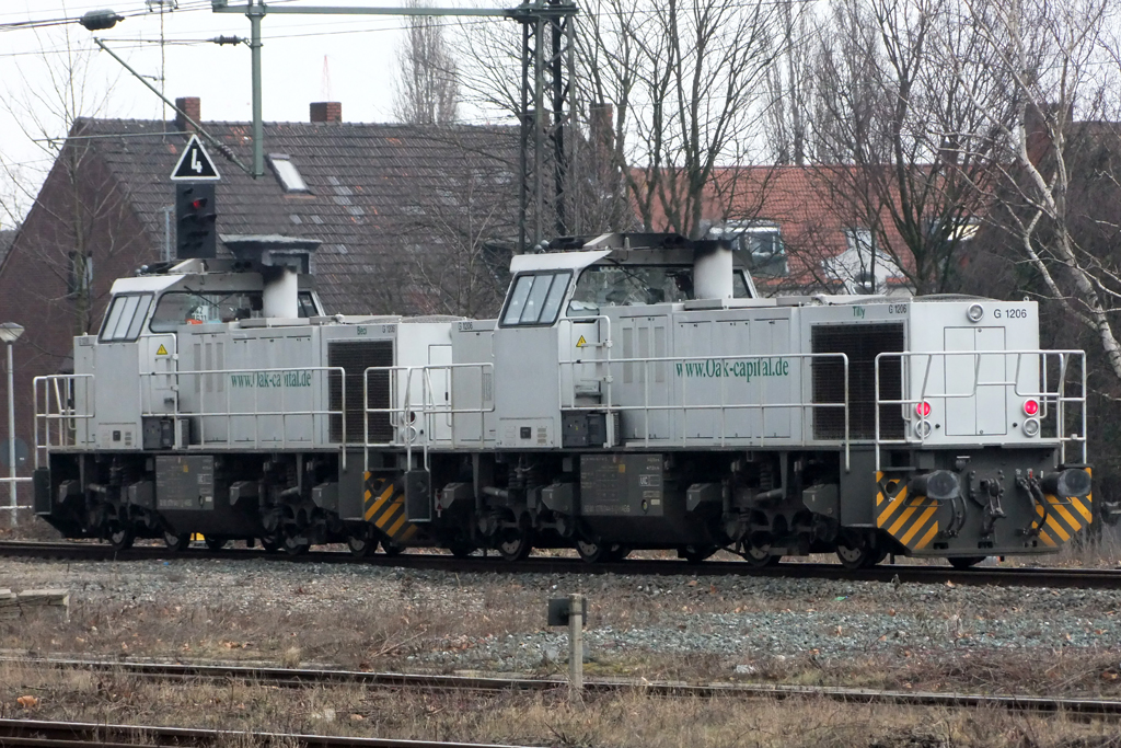 22.2.12 Bf. Bernau. Eine S-Bahn der BR 481 und ein Kesselzug mit 2 MaK von Infraleuna (G 1206 und 210) Richtung Berlin-Karow begegnen sich nahe Wärterstellwerk Bwt.