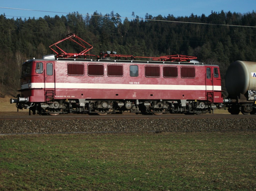 142 110-6 vom Erfurter Bahnservice ist am 22. Februar 2012 mit einem leeren Kesselzug von Neuburg/Donau nach Großkorbetha bei Kronach unterwegs.