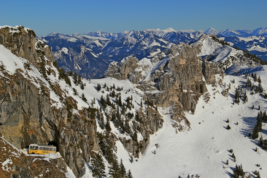 Be 4/4 56, Be 4/4 58 und Be 4/4 57 befinden sich am 17.2.12 oberhalb von Neuhaus.