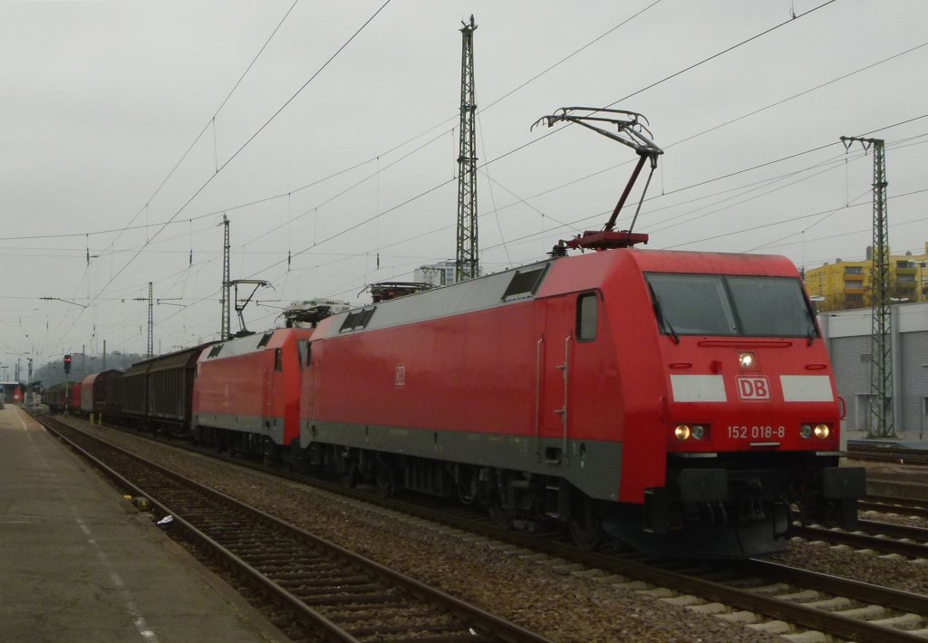 152 018-8 und 152 146-7 ziehen am 23.02.2012 einen gemischten Güterzug durch Kaiserslautern