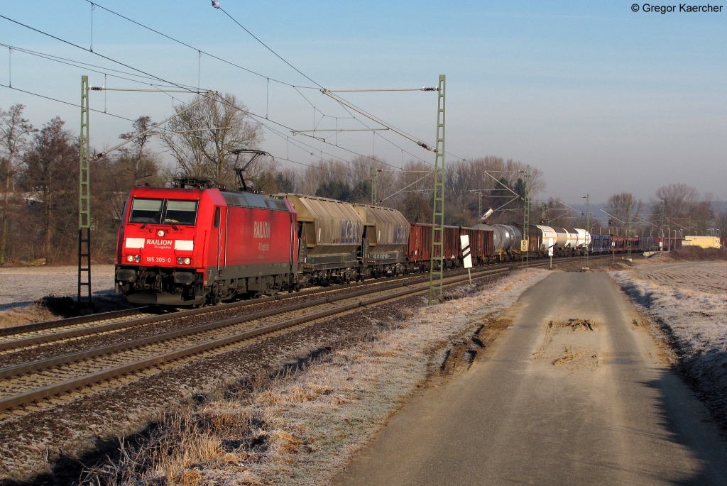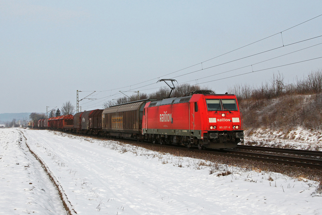 185 227 mit einem gemischten Güterzug am 10.02.2012 bei Pölling.