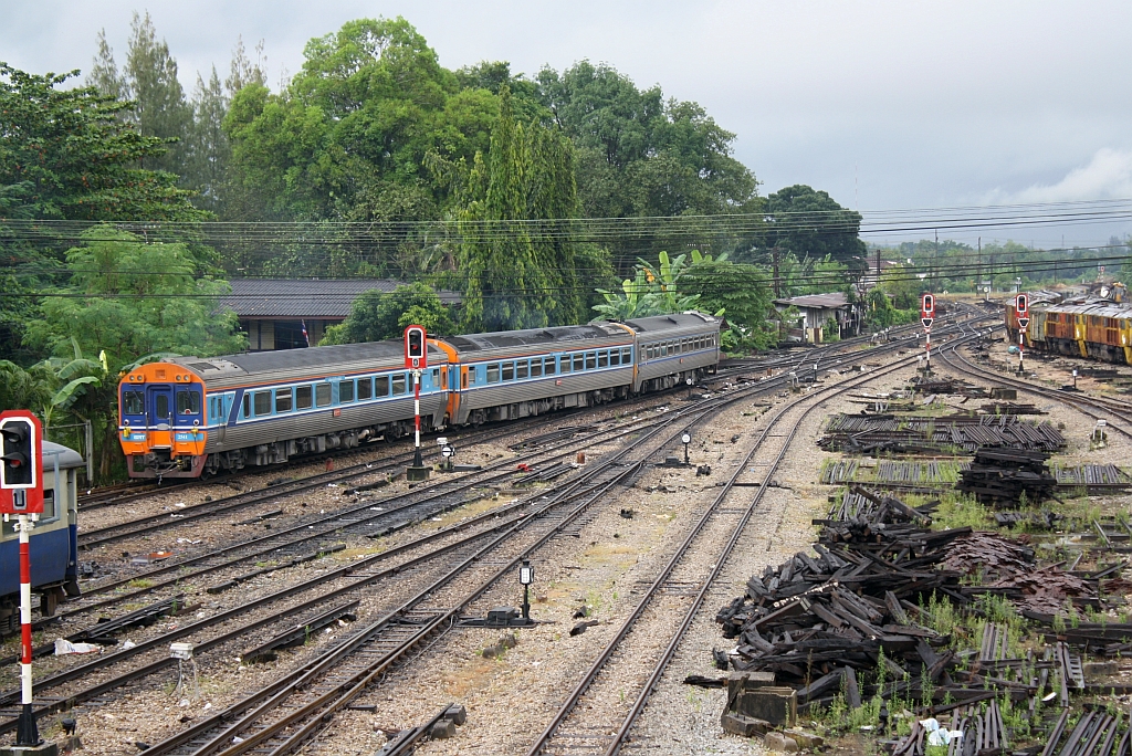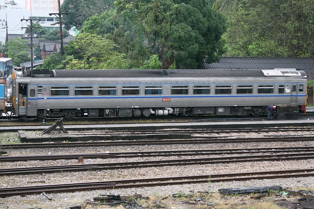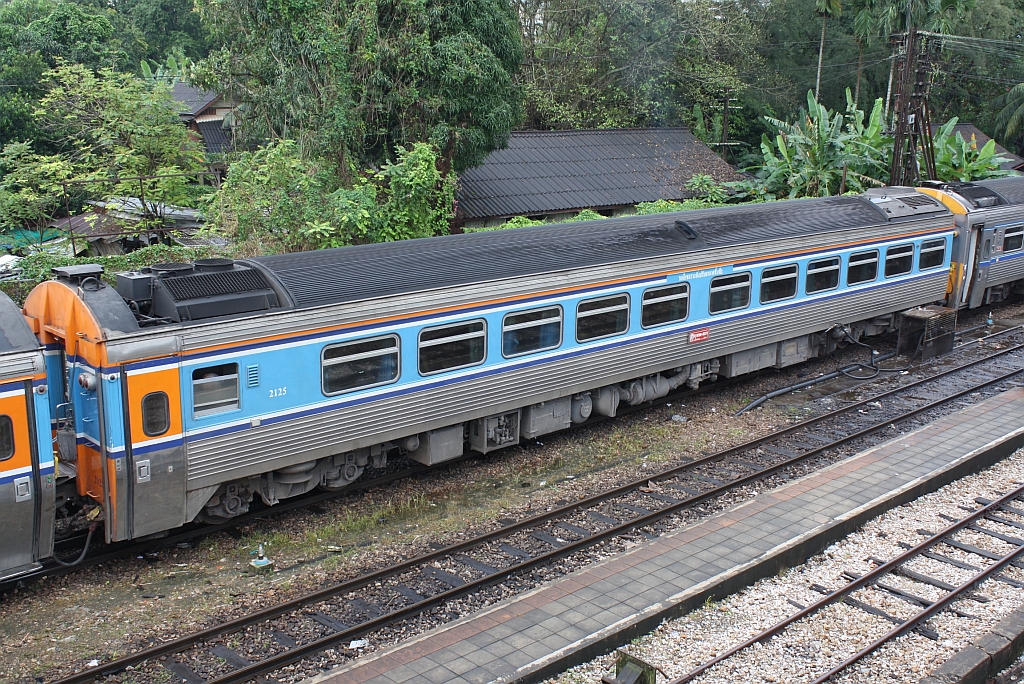 Zu den 12 Triebwagen APD.20 (SRT-Nr. 2513 - 2524) wurden von Daewoo Heavy Industries 1995 auch 8 Triebwagen ohne Führerstand (SRT-Nr. 2121-2128) geliefert. - Das Bild zeigt den, im SP EXP DRC 41 nach Yala eingereihten APN 2125 am 12.Jänner 2012 an der Tankstelle der Hat Yai Junction.