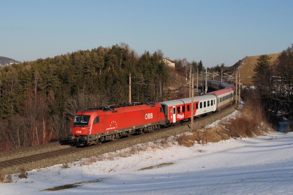 Die 1116 220 mit einem RJ am 04.02.2012 unterwegs bei Niederaudorf.