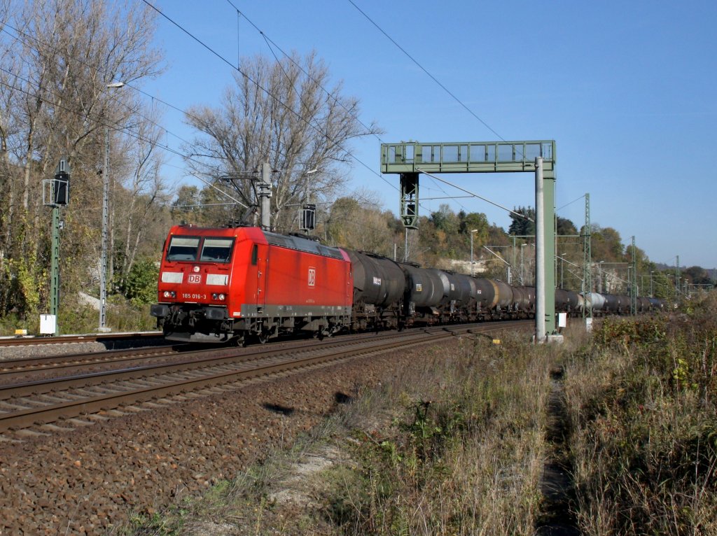 Die 185 016 mit einem Kesselwagenzug am 17.10.2011 unterwegs bei Bad Kösen.