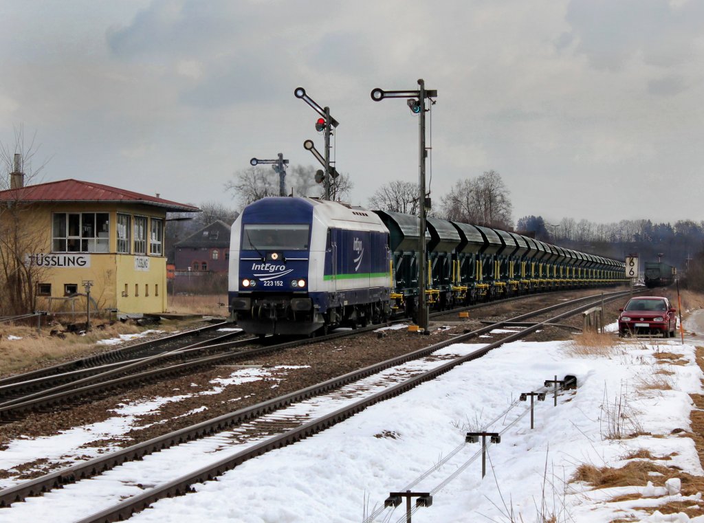Die 223 152 mit einem Schüttgutwagenzug am 20.02.2012 bei der Ausfahrt aus Tüßling.
