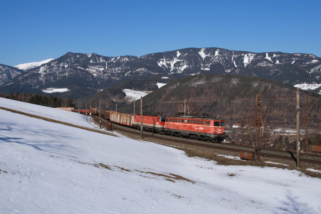 1142 632 fährt mit Güterzug 64525 von St.Michael nach Zeltweg. St.Lorenzen 22.2.2012