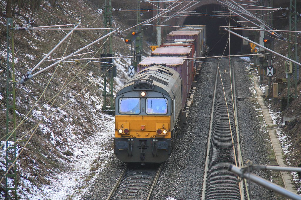 Die Class 66 DE6307 von DLC Railways zieht einen Containerzug aus dem Gemmenicher-Tunnel aus Richtung Belgien und fährt die Rampe nach Aachen-West herunter bei Sonne. Aufgenommen bei Reinartzkehl am 21.2.2012.