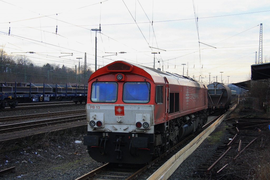 Die Class 66 PB03 "Mireille" von Crossrail fährt mit einem Containerzug von Aachen-West nach Belgien bei Abendstimmung am Rosenmontag 20.2.2012