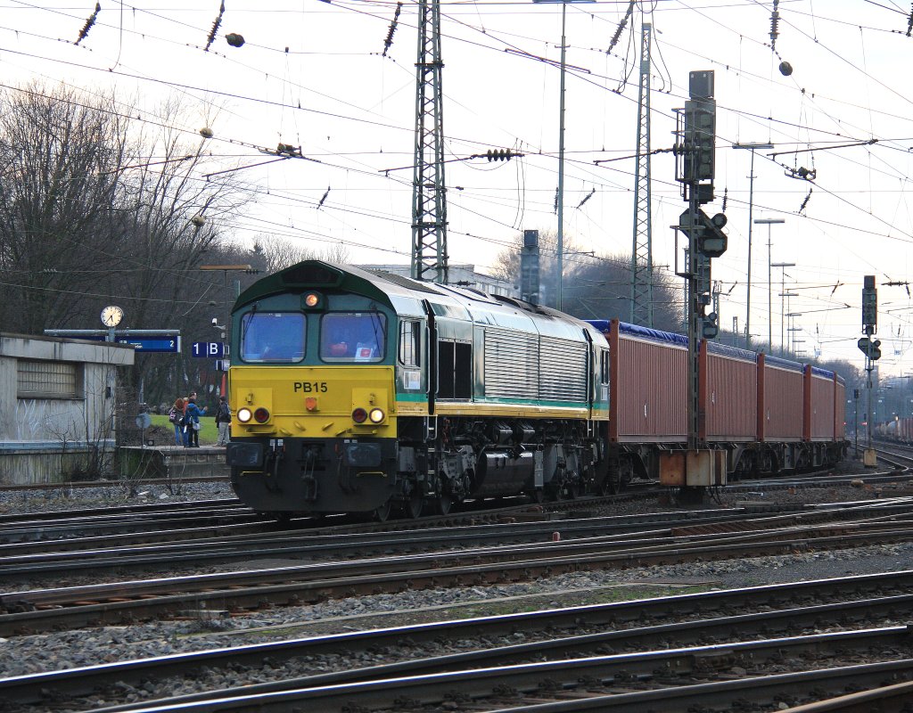 Die Class 66 PB15 von Railtraxx BVBA fährt mit einem sehr langen Containerzug von Aachen-West nach Belgien, am Ende ist eine 145 CL-204 von Crossrail als Schubhilfe bei Abendstimmung am 21.2.2012.