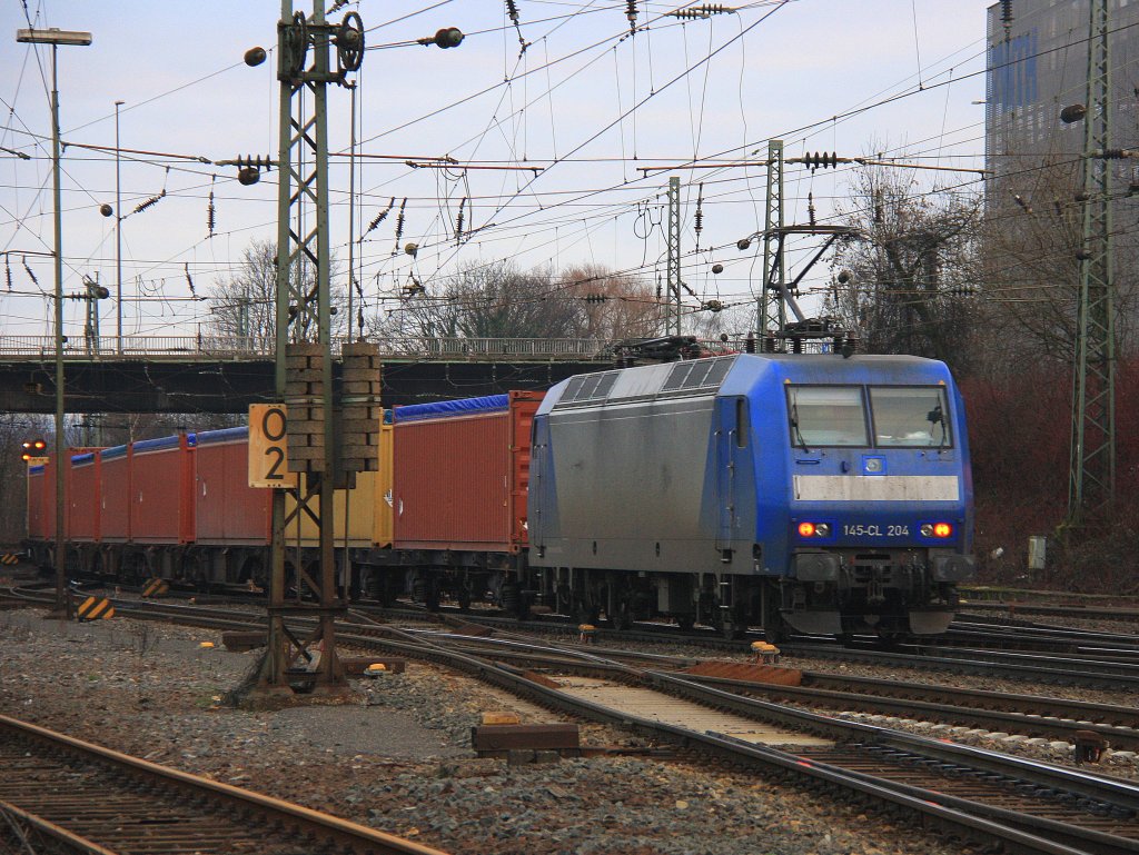 Eine 145 CL-204 von Crossrail als Schubhilfe für einen sehr langen Containerzug in Richtung Belgien bei Abendstimmung am 21.2.2012. Aufgenommen in Aachen-West.