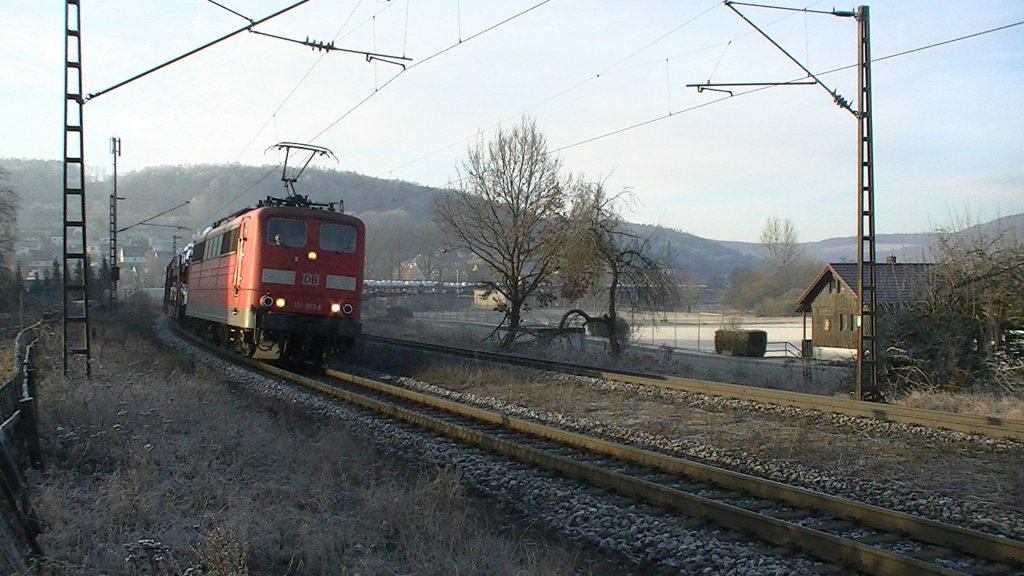 Gut getimt kommen DB Railion 151 133-6 und ein ICE 2 am 21.02.12 bei Hörbach vorbei.