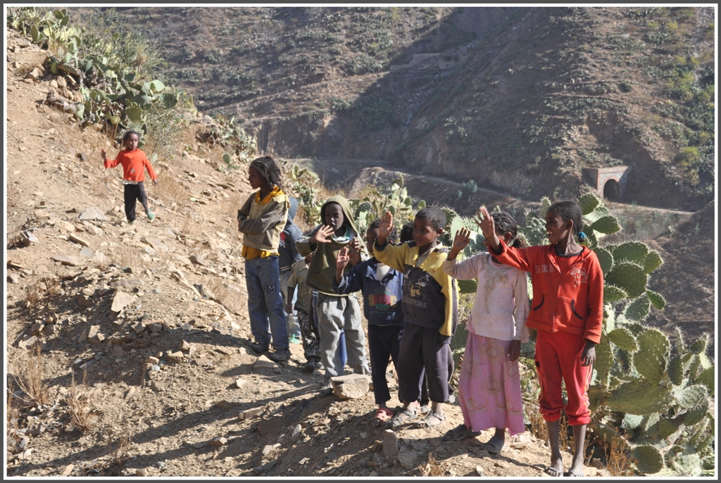 Für mich eine wohltuende Abwechslung waren die stets anwesenden Kinder, die uns hier an der Strecke bei Shegerini fröhlich zuwinken. (31.01.2012)