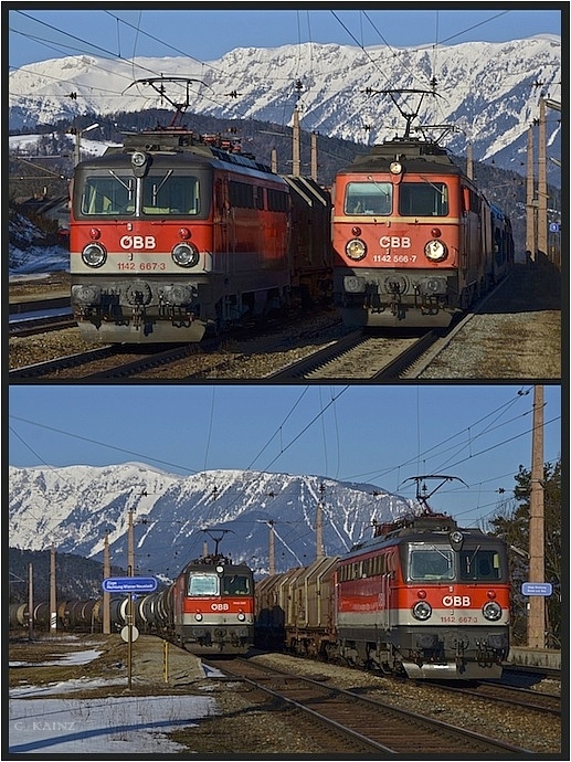 Vor dem schneebedeckten Rax - Plateau, dessen mächtiger 2000m hoher Kalkstock das Landschaftserlebnis an der Semmeringbahn prägt, ist im Bahnhof Eichberg ein von der 1142 667 nachgeschobener Stahlzug auf die Seite genommen worden, um die Überholung eines Schnellzuges und des im zweiten Bild gezeigten Kesselzuges abzuwarten. Der eigentliche Glücksfall, dieser ohnehin schon glückhaften Begebenheit, war jedoch die erste der insgesamt drei Zugbegegnungen, wo ich im Schatten der Teleskophaubenwagen einen bergwärts fahrenden, und von der blutorangen 1142 566 vorgespannten Autozug vor dem herrlichen Gebirgshintergrund aufnehmen konnte, wo bei dem exklusiven 42er Stelldichein auch die mitwirkende 1116 nahezu unsichtbar bleibt ...