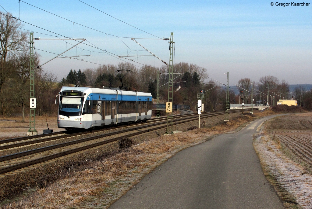 Wagen 1018 der Saarbahn als S9 nach Mühlacker bei Helmsheim. Bis Ende 2012 werden diese Fahrzeuge noch auf der KBS 710.9 (Bruchsal-Bretten-Mühlacker) verkehren. Aufgenommen am 21.02.2012.