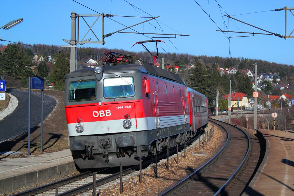 1144 266 durchfährt mit einem Personenzug den Bahnhof Dürrwien am späten Nachmittag den 22.02.2012 Richtung St.Pölten.
