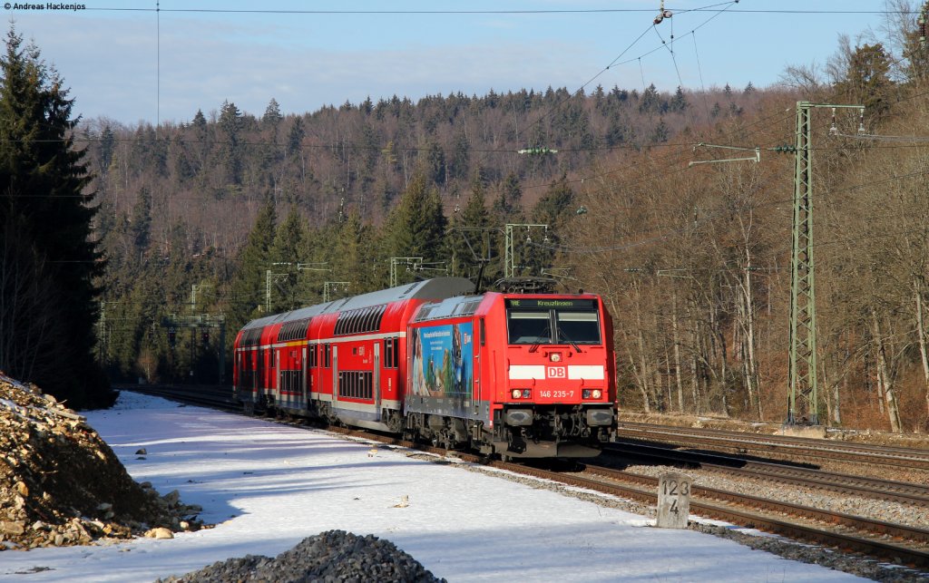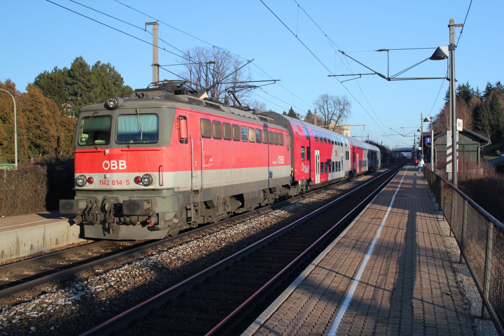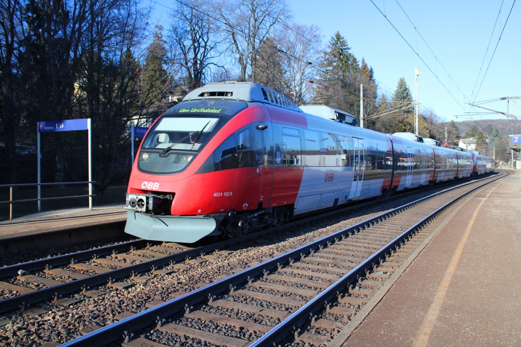 R 2031 beim Verlassen des Bahnhofes in Eichgraben, windet sich noch einige Höhenmeter empor, bevor es am höchsten Punkt der Westbahn im Wienerwald in der nächsten Station Rekawinkel (360 m ü.M.) nur mehr bergab Richtung Wien Westbahnhof geht. Eichgraben am 22.02.2012