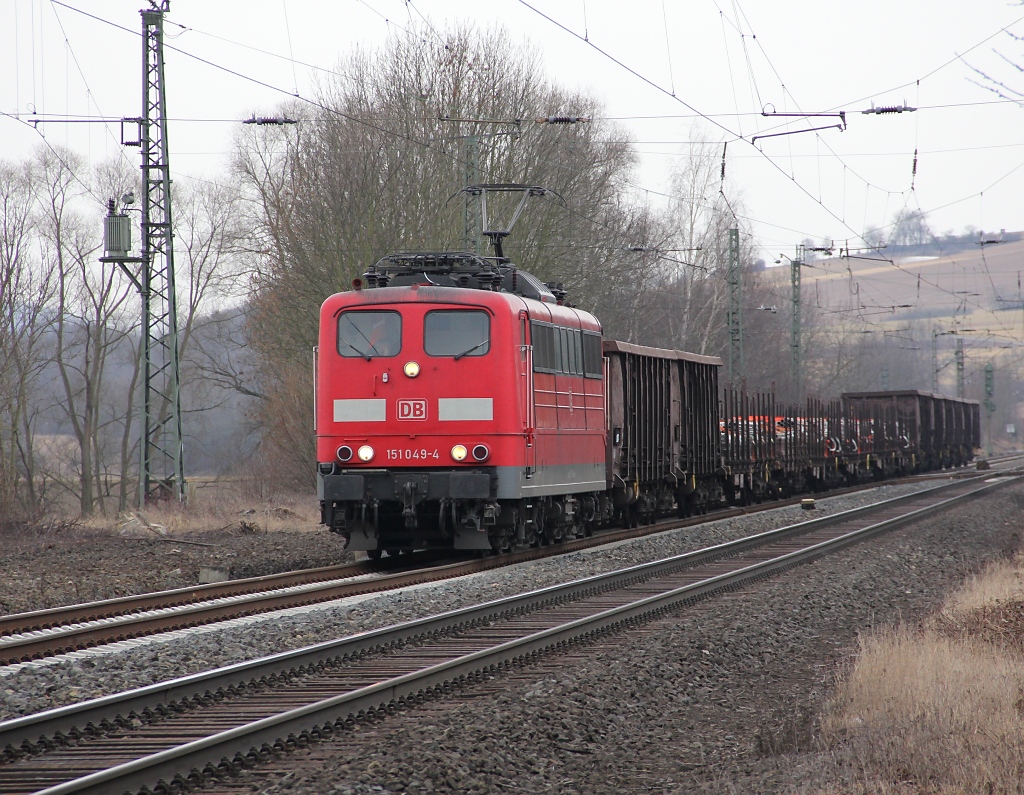 151 049-4 mit Kurzzug in Richtung Norden. Aufgenommen kurz vor Eschwege West am 21.02.2012.