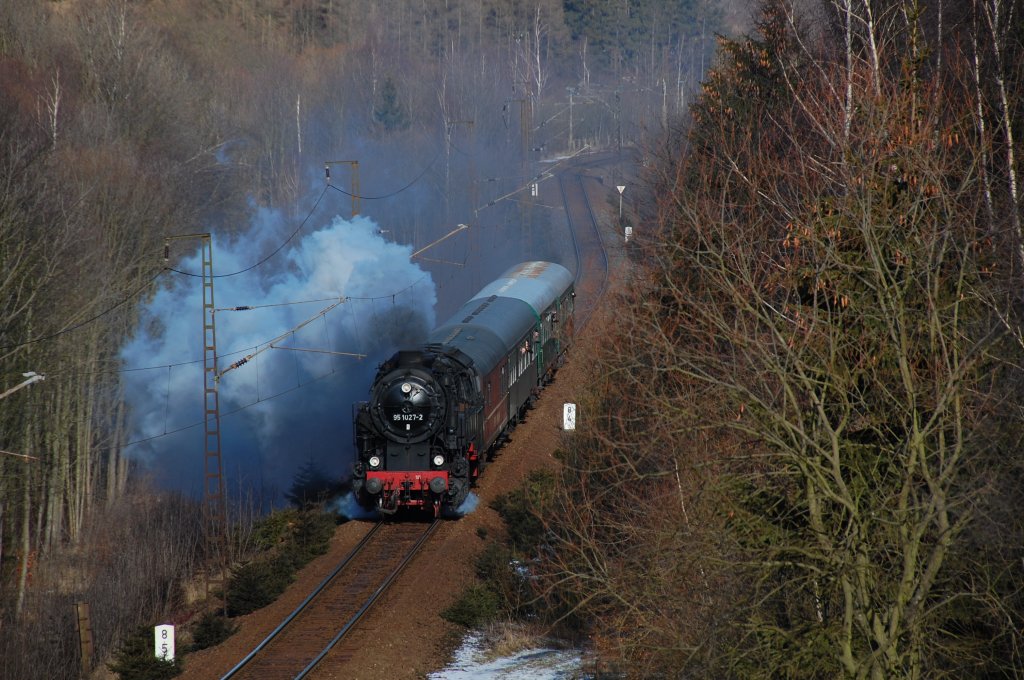 95 1027-2 rollt hier mit ihrem Sonderzug von Blankenburg nach Rübeland kurz hinter dem ehem Hp Braunesumpf hinab um genug Schwung für die anstehende letzte Steigung hinauf nach Hüttenrode zu bekommen, 19.02.2012.