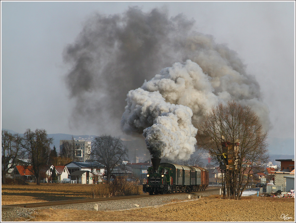 Dampflok 671 der Gkb fährt mit dem SPZ 8519 von Graz Köflacherbahnhof nach Wies Eibiswald. Pirka 5.2.2012