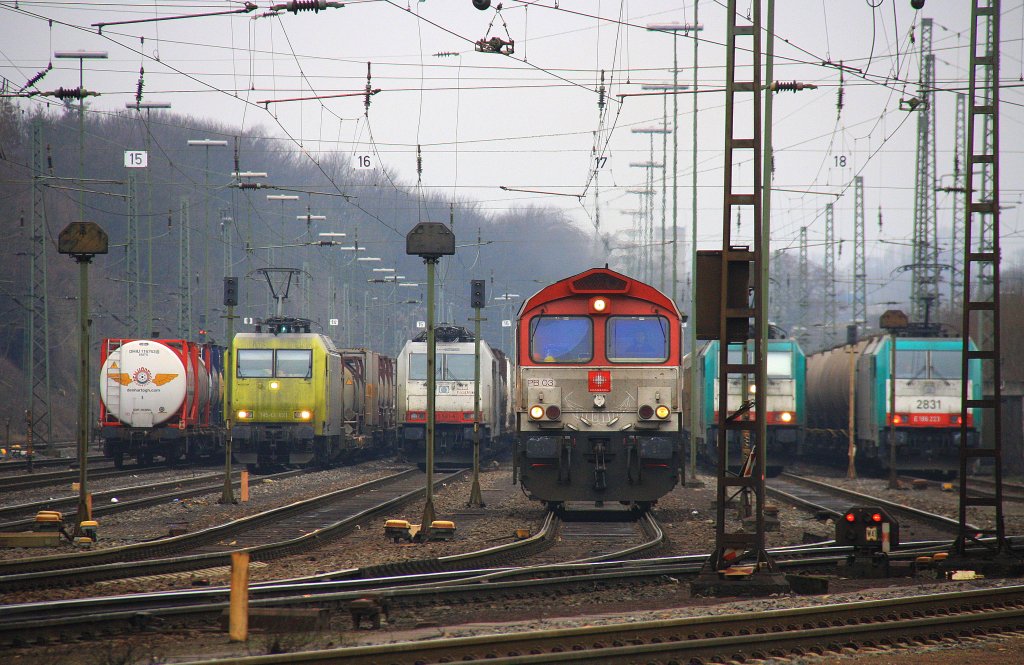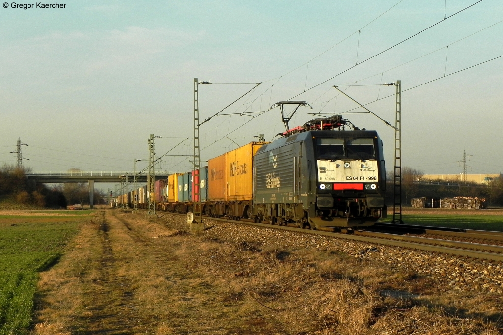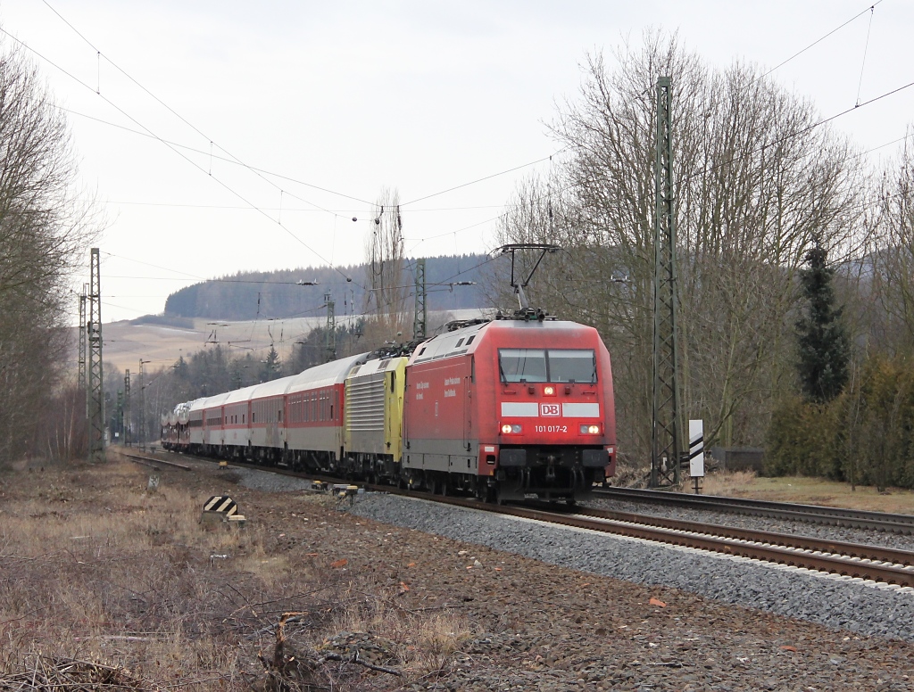 Musste da die 101 017-2 Schützenhilfe leisten weil die 189 908 schlapp gemacht hat? Keine Ahnung. Auf jeden Fall bietet diese Konstellation vor dem AZ in Richtung Norden ein ungewohntes Bild. Aufgenommen am 21.02.2012 am BÜ Eltmannshausen/Oberhone.