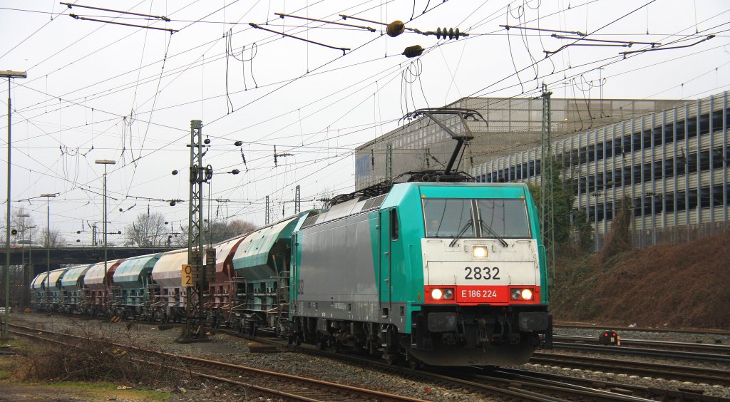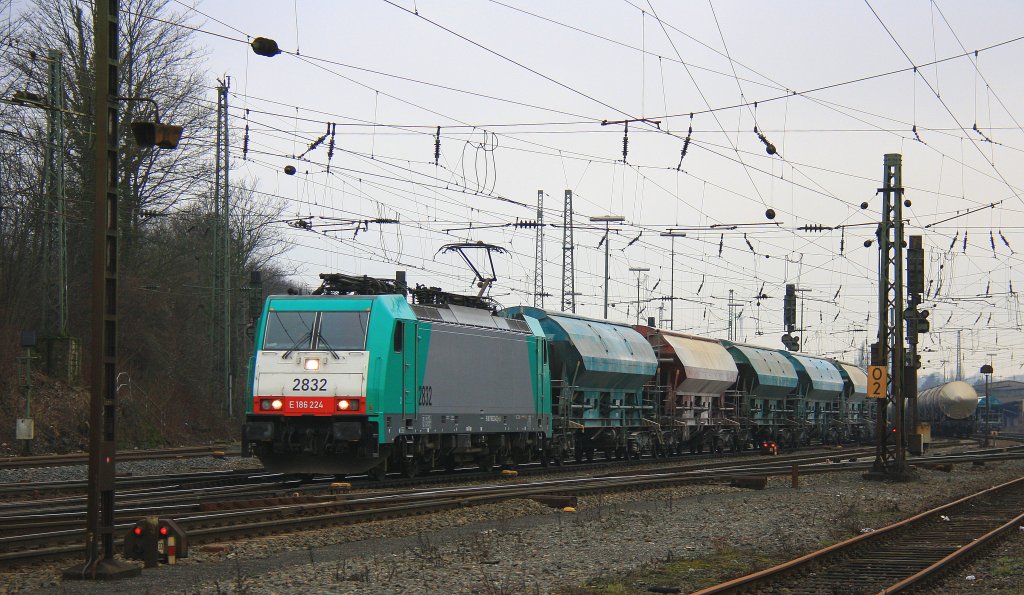 Die Cobra 2832 fährt mit einem Kalkleerzug aus Oberhausen nach Hermalle-Huy(B) bei der Abfahrt aus Aachen-West bei Wolken am 24.2.2012.