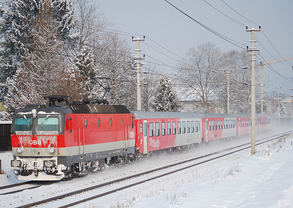 Die vereiste 1144 104 mit einem REX nach Wörgl bei Salzburg-Süd. (Februar 2012)