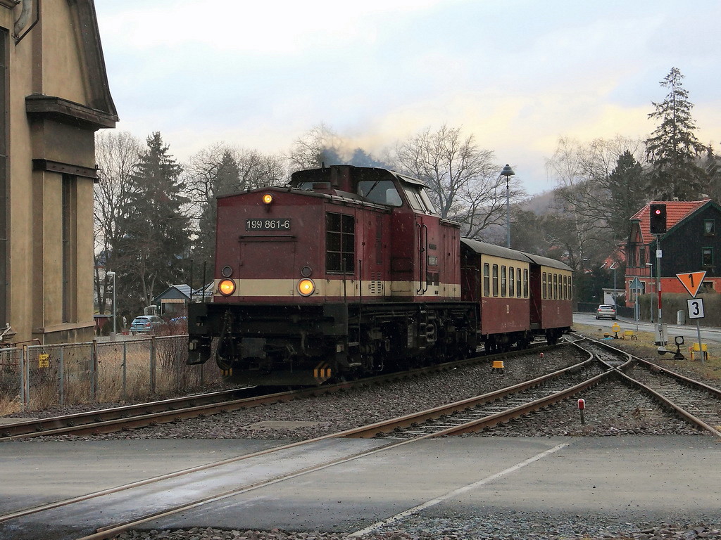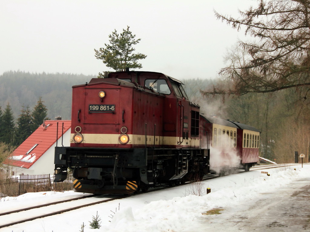 Hasserode am 19. Februar 2012, 199 861-6 als Triebwagenersatz mit HSB 8905  Richtung Eisfelder Talmühle.