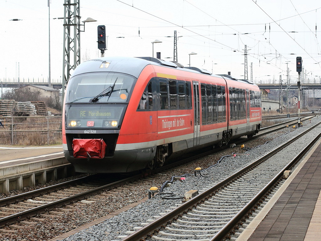 Nordhausen am 18. Februar 2012, Einfahrt 642 528 als RE 4664 von Halle(Saale)Hbf.