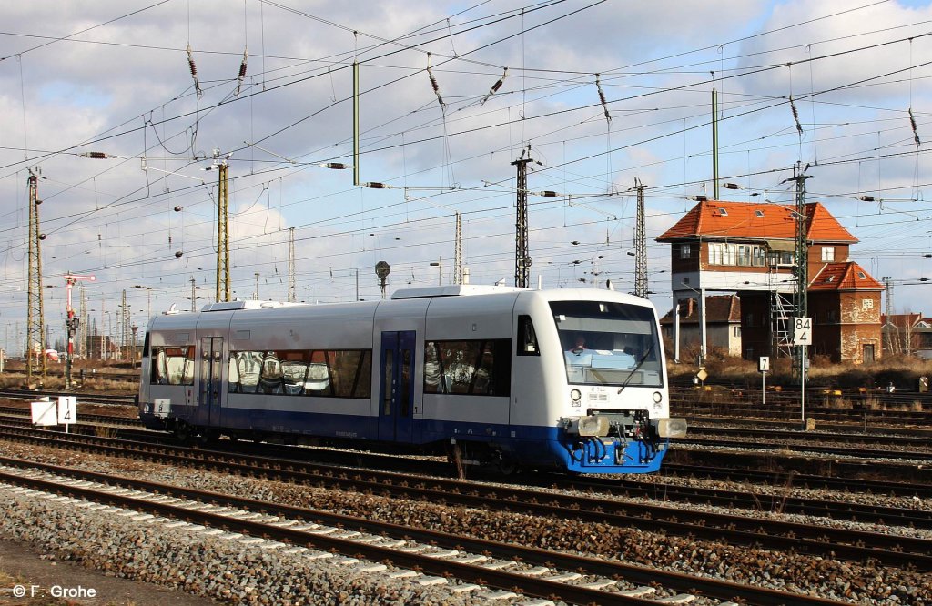 RTB 650 744-5 Rurtalbahn VT 744 Stadler Regio-Shuttle RS1 fährt als  seltener Gast  aus Richtung Bitterfeld kommend am Güterbahnhof Halle Saale entlang, fotografiert am 20.02.2012