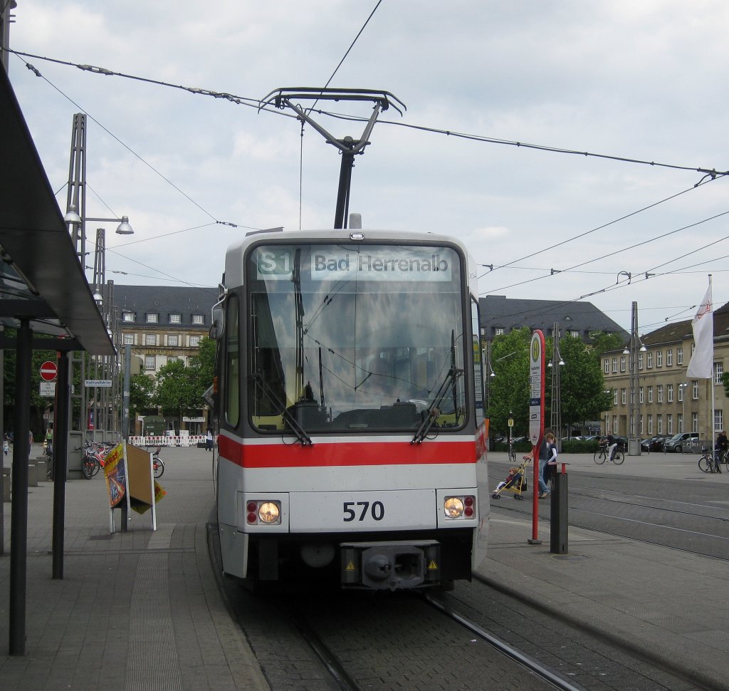 Tw 570 am 03.06.2010 als S1 von Hochstetten nach Bad Herrenalb. In Ettlingen Stadtbf wird sich noch Tw 501 dazugesellen um dan gemeinsam ins Albtal aufzubrechen. Der  ICE  fährt nun auf den Hbf-Vorplatz Karlsruhe.
