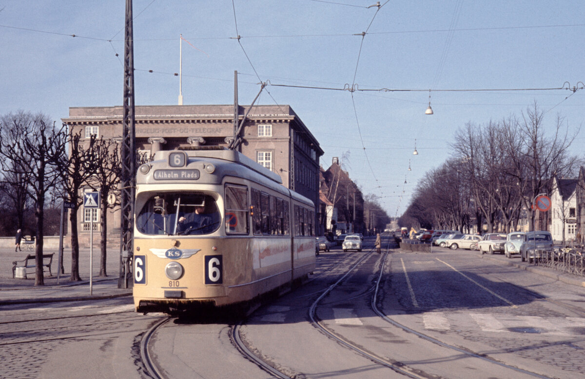 København / Kopenhagen Københavns Sporveje (KS) SL 6 (DÜWAG/Kiepe-GT6 810) København Ø, Østerbro, Øster Allé / Trianglen am 1. Februar 1969. - Scan eines Diapositivs.
