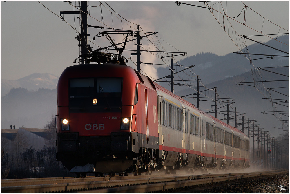 1116 195 zieht IC 731  Kelag Energie Express  von Wien Meidling nach Villach. Zeltweg 16.1.2012