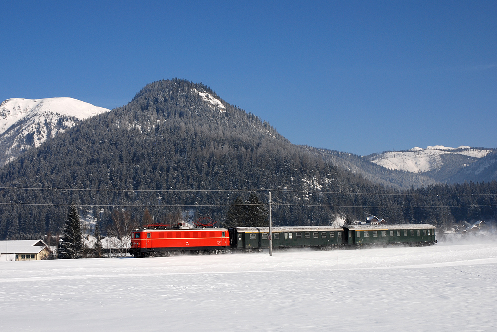 1141.21 der ÖGEG (Österreichische Gesellschaft für Eisenbahngeschichte) durchfährt am 08.02.2012 mit SE 14440 von Graz nach Salzburg (Sonderzug für eine englische Reisegruppe) das Salzkammergut und befindet sich zum Zeitpunkt der Aufnahme vor der Kulisse der Tauplitzalm im Ortsgebiet von Bad Mitterndorf.