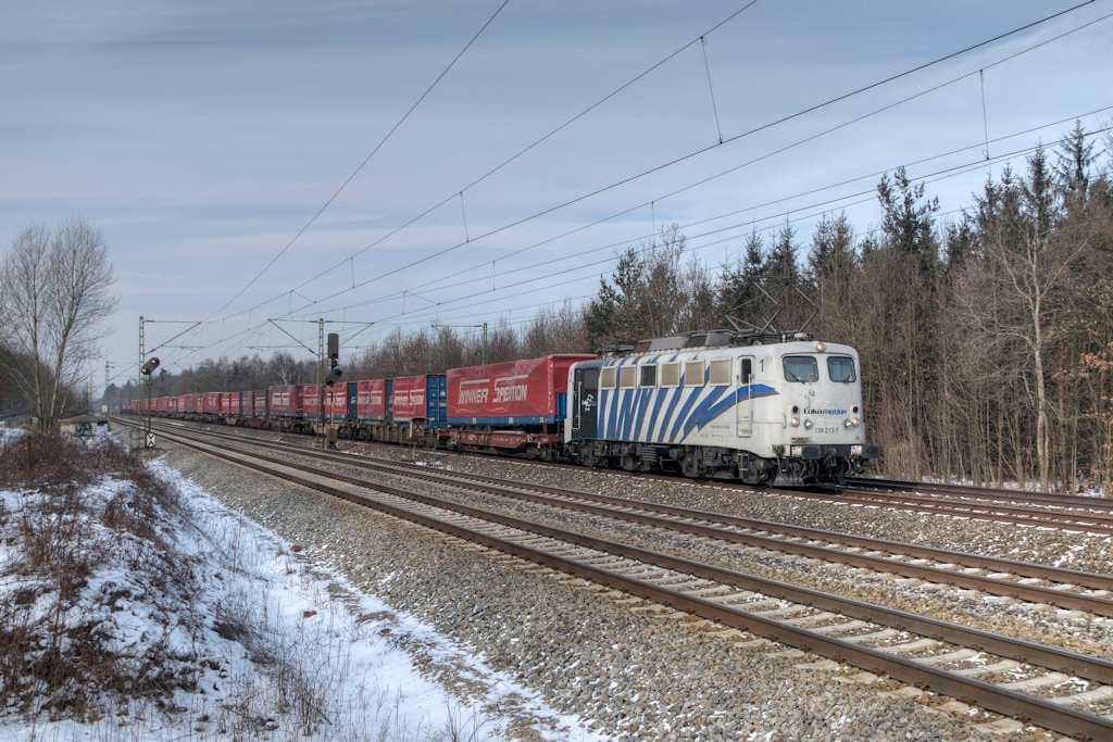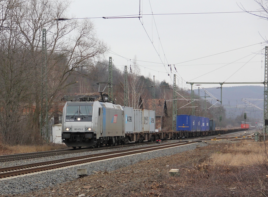 185 673-2 mit Containerzug in Fahrtrichtung Süden. Aufgenommen am 21.02.2012 beim BÜ Eltmannshausen/Oberhone.