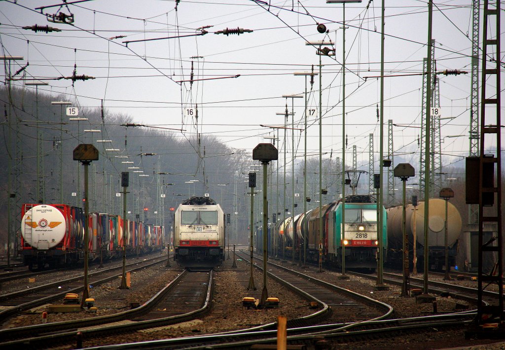 185 581-6 von Crossrail steht in Aachen-West mit einem Containerzug, rechts daneben steht die Cobra 2818 mit einem gemischten Güterzug bei Wolken am 24.2.2012.
