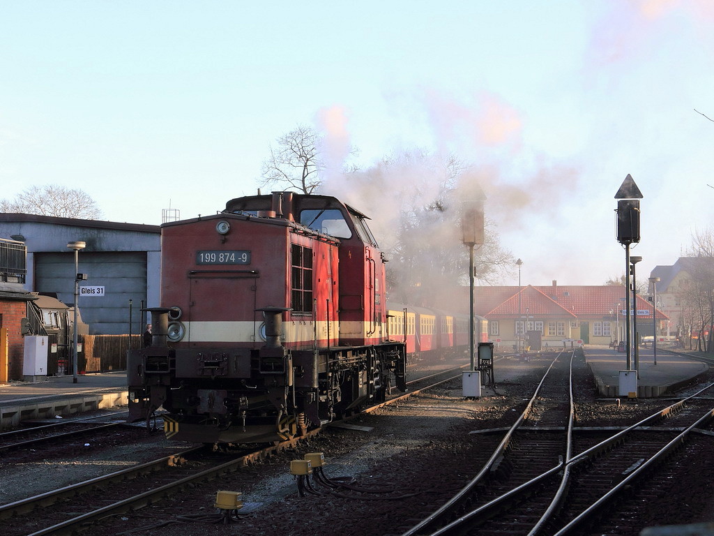 199 874-9 steht mit hochgeklappten Puffern, die bestimmt sind für den Rollbockverkehr,  im Bahnhof Wernigerode am 20. Februar 2012.
