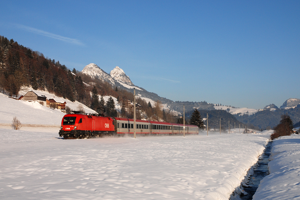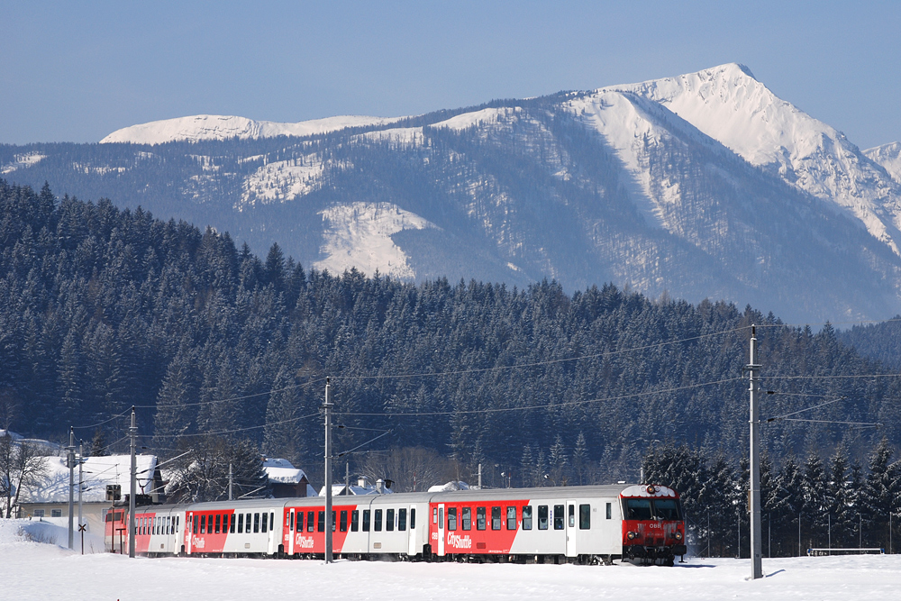 Seit dem letzten Fahrplanwechsel im Dezember 2011 wird das Zugpaar 3416-3427 von einer Maschine der Baureihe 1x16 bespannt (bisher zumindest unter der Woche mit 1044). Am späten Nachmittag des 08.02.2012 bespannte 1116 096 den REX 3427 "Salzkammergut" und wurde direkt vor der Schiflugschanze Kulm aufgenommen.