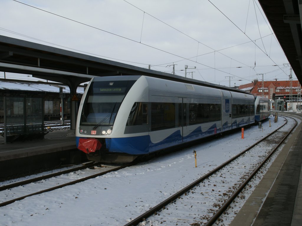 Als UBB 29421 warteten 646 104 und 646 110,am 11.Februar 2012,in Stralsund auf Reisende in Richtung Swinoujscie.