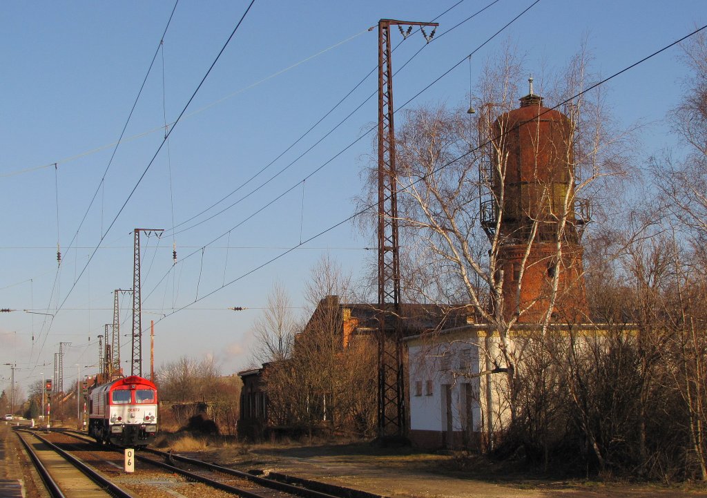 Am 20.02.2012 wartete die HGK DE 672 (92 80 1266 072-8 D-HGK) neben dem alten Wasserturm in Großkorbetha auf neue Aufgaben.