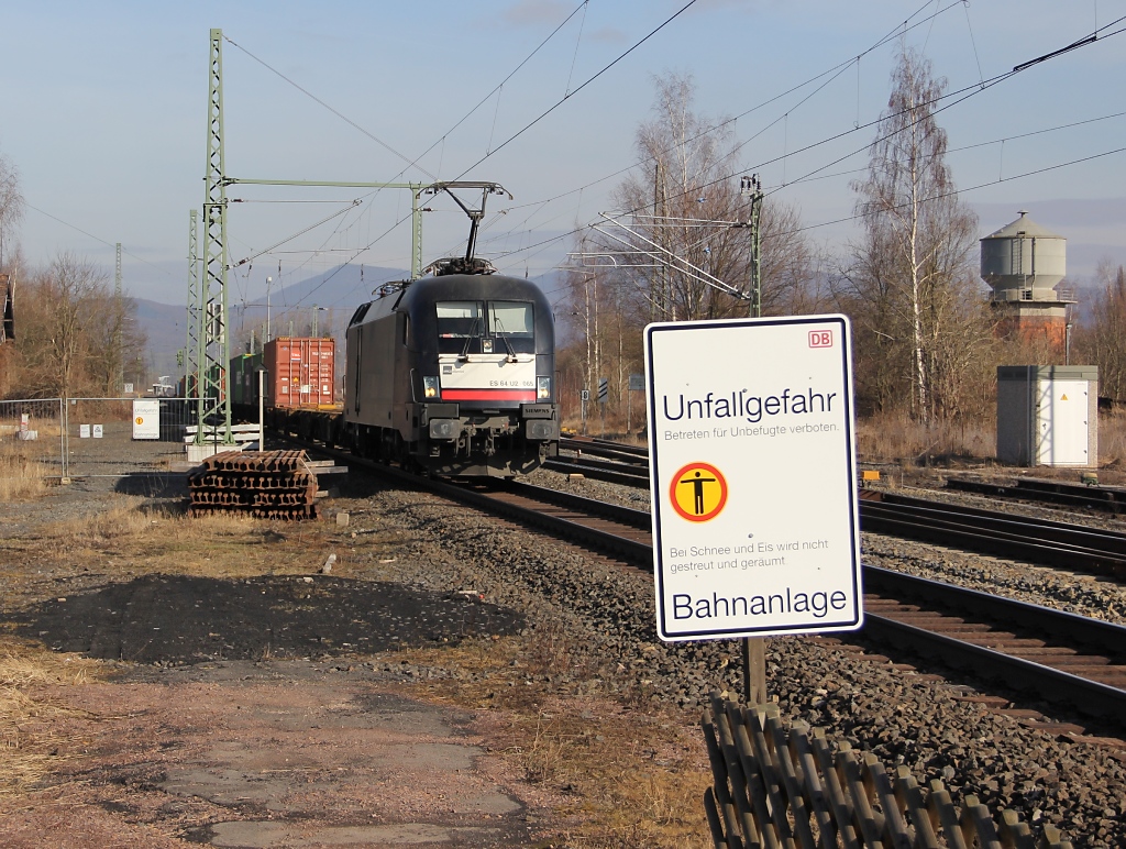 Am BÜ Eltmannshausen/Oberhone können manchmal nicht genug Schilder stehen für ungeduldige Autofahrer und Fußgänger... Hier kommt gerade 182 565 (ES 64 U2-065) mit Containerzug in Richtung Süden vorbei. Aufgenommen am 22.02.2012.