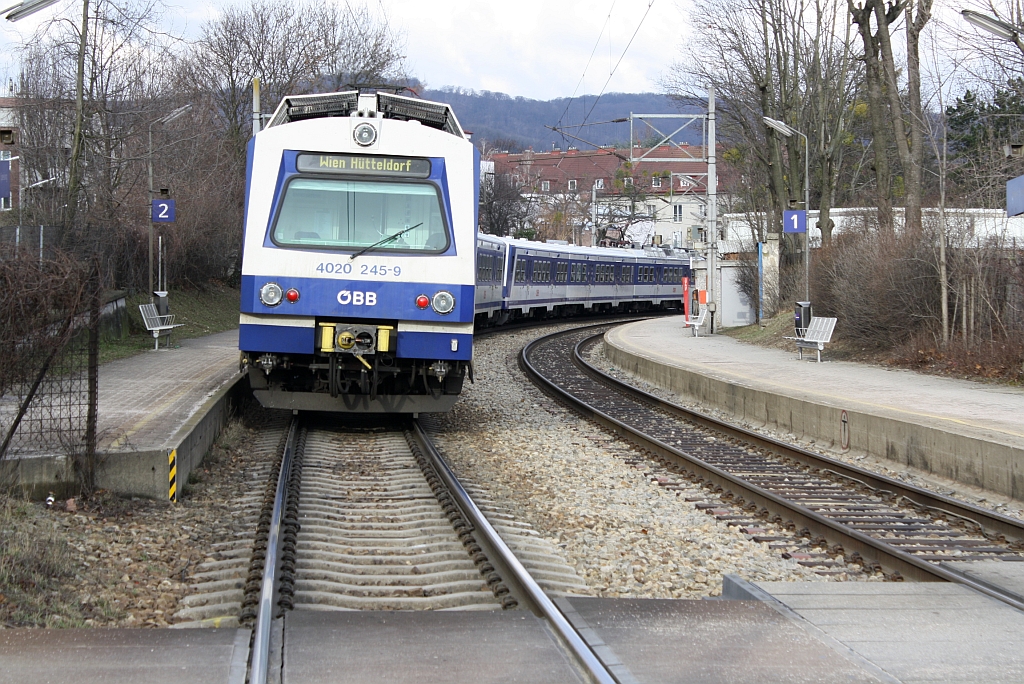 Da der Schranken sehr schnell öffnete, gelang mir dieses Bild: 4020 245-9 als S15 nach Hütteldorf am 25.Februar 2012 in der Hst. Speising.