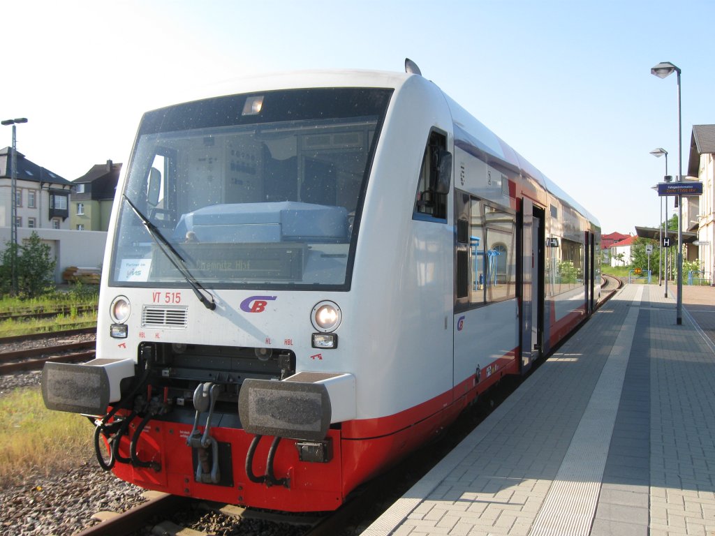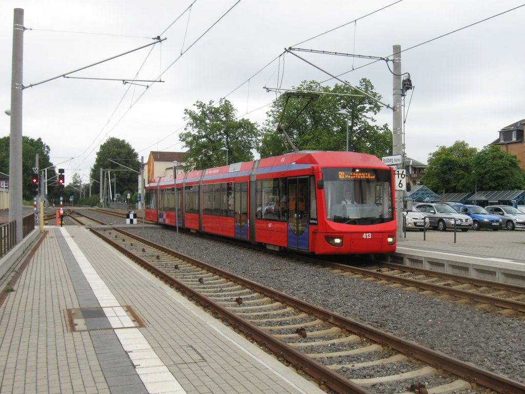 ET 413 kommt am 4.8.2011 um 9:14 Uhr als Linie 522 aus Chemnitz in Stollberg an.