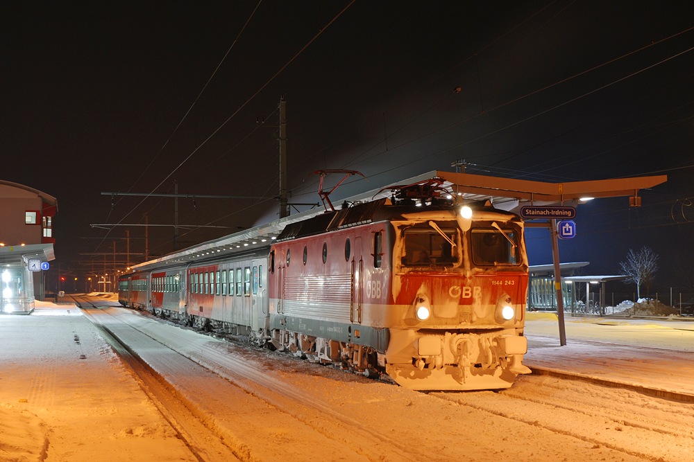 In den Abendstunden des 09.02.2012 wartet 1144 243 mit ihrer Garnitur als R 3437 nach Bad Aussee ihre Abfahrtszeit in Stainach-Irdning ab.