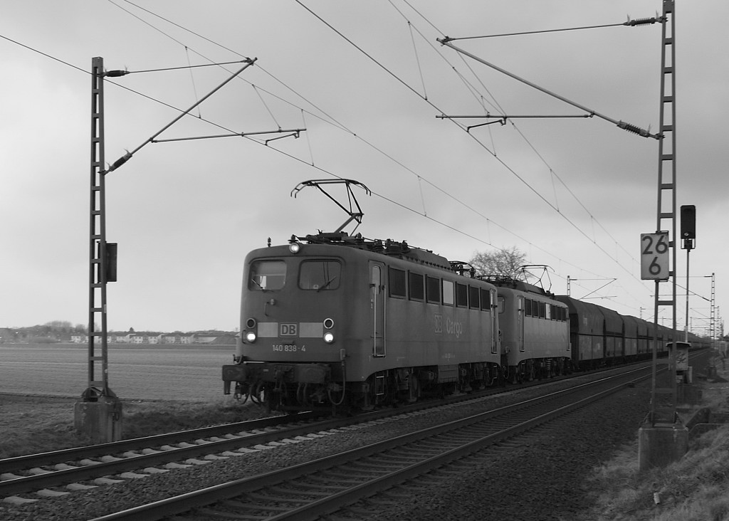Mal ein schwarz/weiß Bild gemacht vom dem beiden 140zigern. Es sind die 140 838-4 und die 140 815-2 die mit den Massengutwagen hier bei Allerheiligen zu sehen sind. 25.2.2012