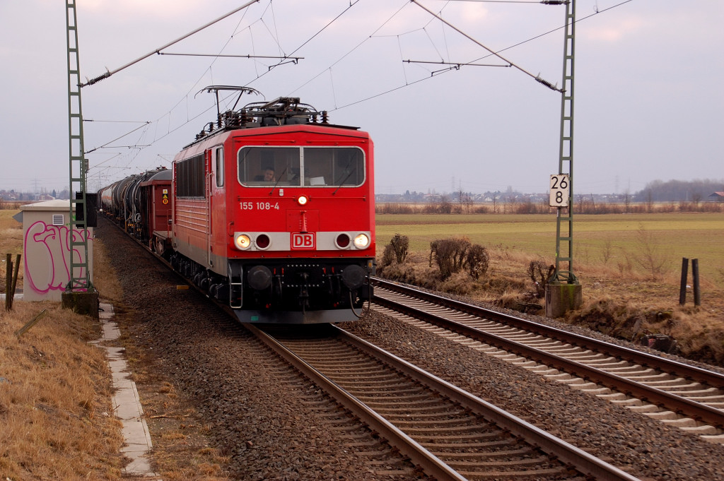 Mit einem sehr langen Güterzug am Hacken kommt aus Richtung Köln die 155 108-4. Hier ist sie kurz vorm Hp Neuss Allerheiligen abgelichtet. Überigens eine genau so freundlichen Gruß an den Tf zurück,25.2.2012