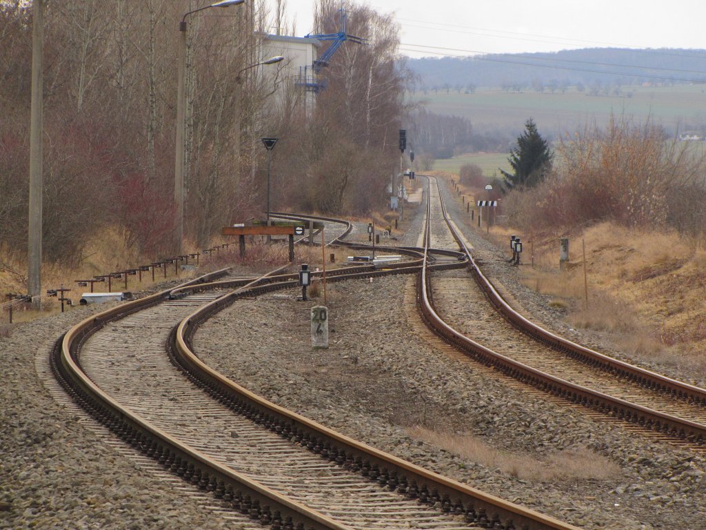 Ungewöhnliche Gleisführung zur Anschlussbahn ins Zementwerk Karsdorf. Das rechte Gleis ist das Streckengleis der Unstrutbahn; 19.02.2012