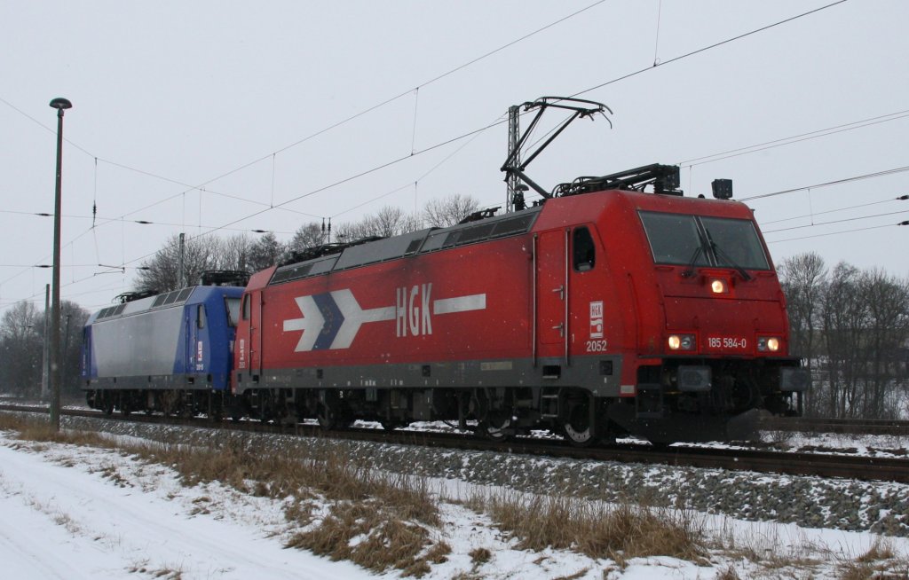 12.02.2012 Passow. 185 584-0 mit 145-CL-201 kurz vor dem Abzweig zur Werkbahn nach Stendell.