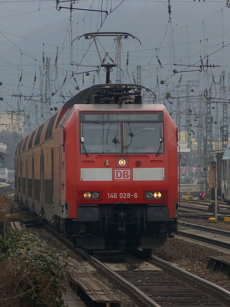 146 028-6 mit dem RE10518 (Koblenz-Emmerich) hat am 27.2.12 den Koblenzer Hbf verlassen und ist kurz vor dem Hp.Koblenz-Stadtmitte.