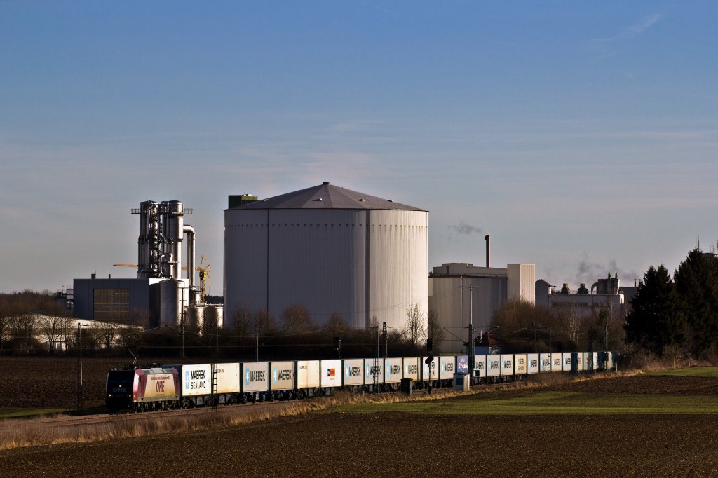 Die 185 573 mit einem Containerzug am 25.02.2012 unterwegs bei Vilshofen.